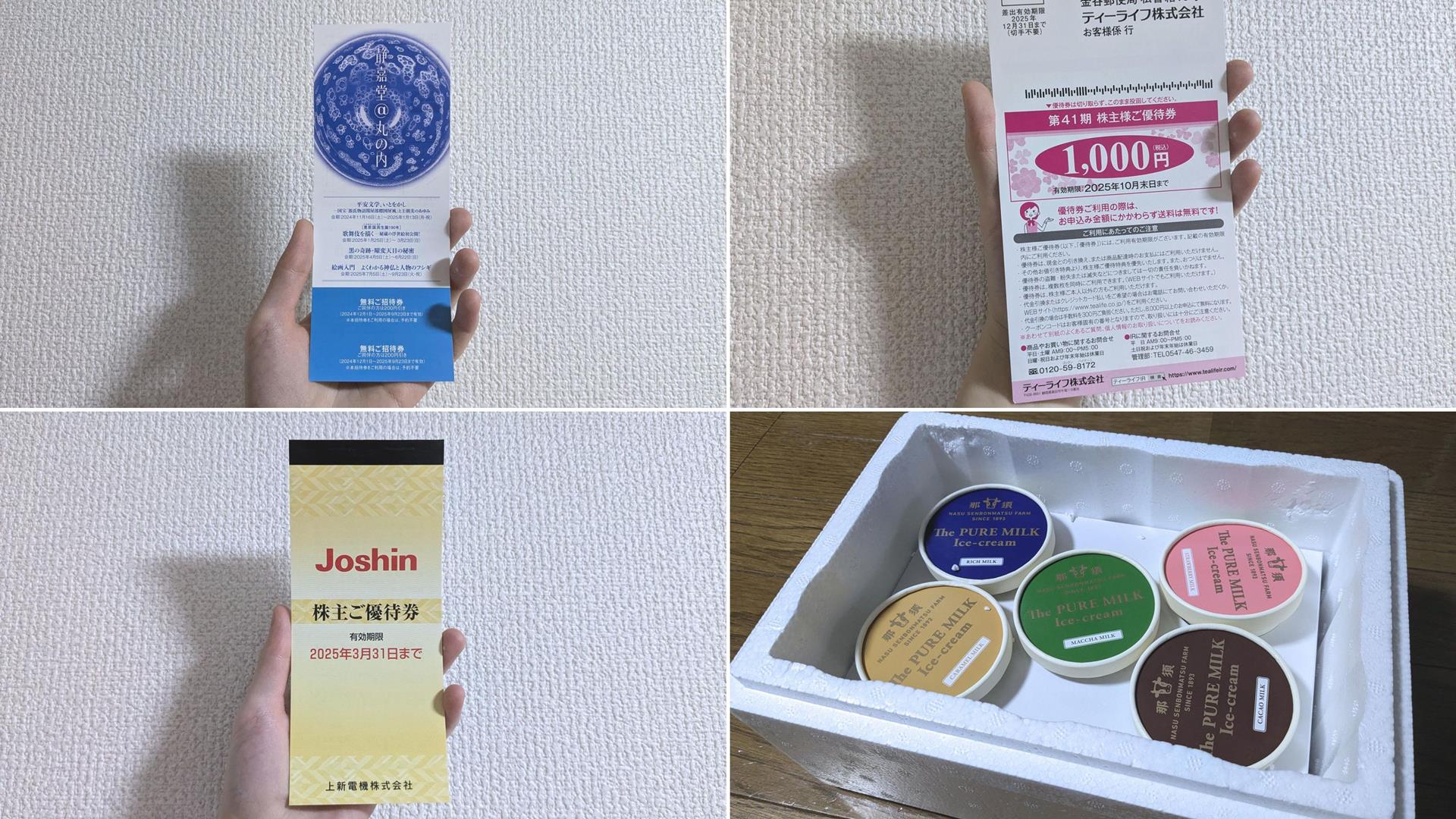 2024年、株主優待でもらったもの 2024年に手に入れた株主優待まとめです。基本には株で利益出たら即売りに出すスタイルなのですが、最近株主優待に興味が出たのでちょこっと集めています。数が少ないので来年にもっと増やしたいな~という計画も込めています。2025年にもらった株主優... お金を整える