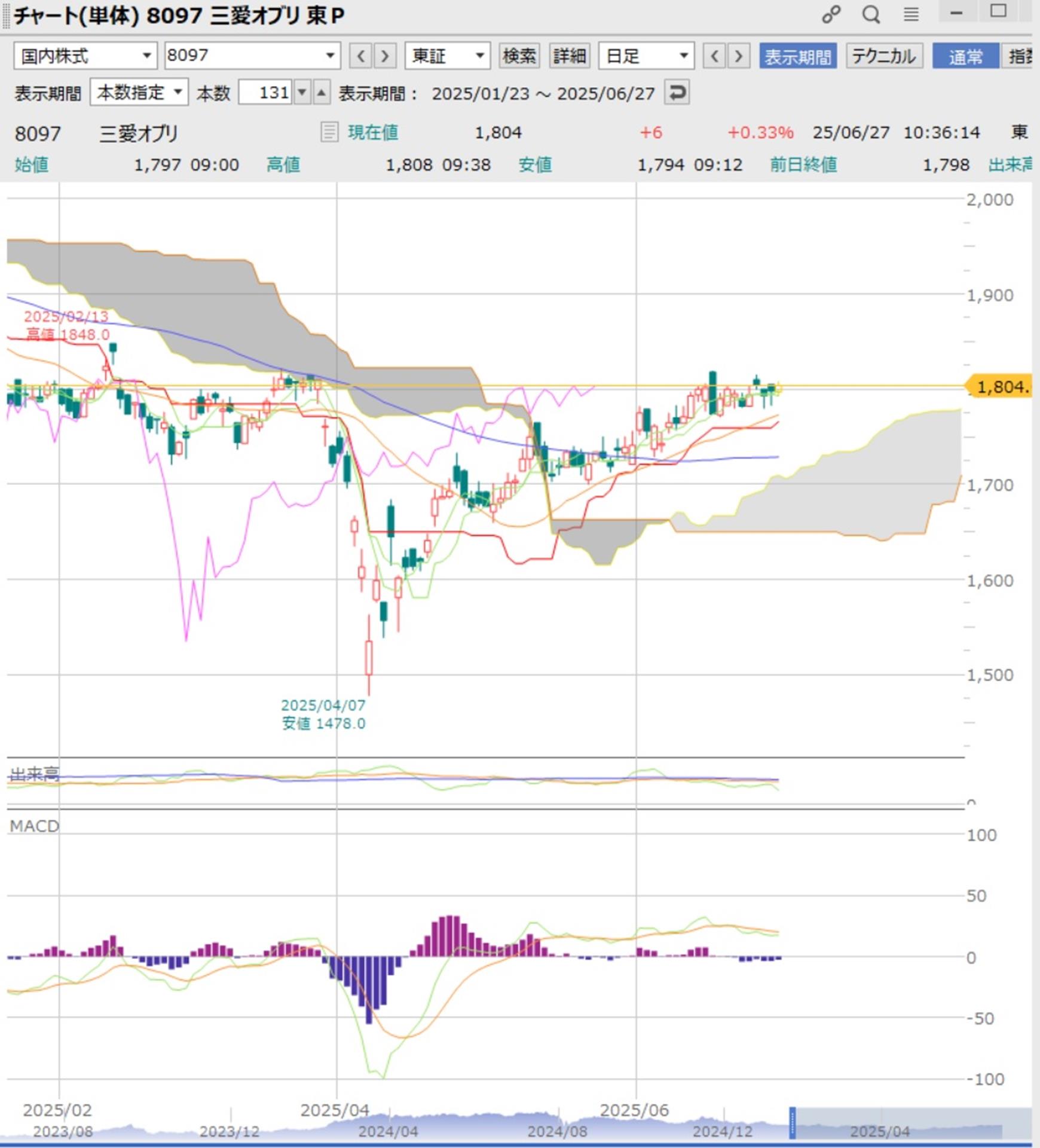 【8097】三愛オブリを買ってみた。教科書のようなチャート 昨日、SNSで銘柄探しをしたときに、配当金100円が下限配当利回り5.54%(2025年6月27日時点)の三愛オブリを購入しました。分析の参考になったポスト購入タイミングを見計らっていたとき、チャート形状があまりにも教科書通りだったのでメモ... お金を整える